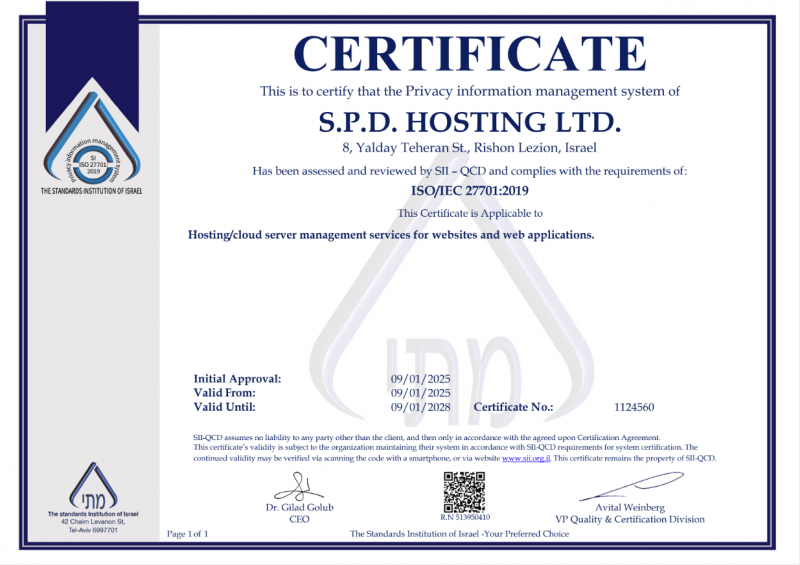 תקן בינלאומי לניהול פרטיות המידע, המספק מסגרת לניהול פרטיות המידע, כולל תהליכים, מדיניות ובקרות והסמכתו מציגה את המחויבות להגנה על פרטיות המידע בחברת SPD ושל לקוחותינו.